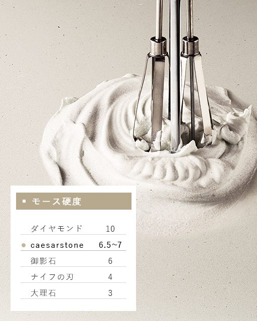 もっとも硬い素材の一つであるクォーツが大半を占める本製品は、大理石や御影石よりはるかに硬く、耐久性に富んでいます。天然石の素材の美しさを維持しながらも、汚れがつきやすい、傷つきやすいといった石の弱さを最新のテクノロジーによって開発された新素材として解決しました。