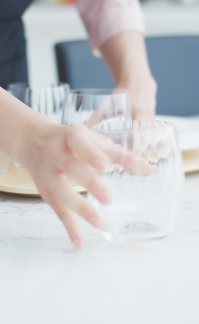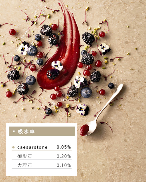 表面に空隙(小さな穴)がないので、吸収率の低い素材です。細菌の繁殖の原因になる水分や汚れの染み込みが少なく、多孔質な天然石にくらべ、簡単なお手入れで美しく清潔に衛生的な状態が、半永久的に続きます。