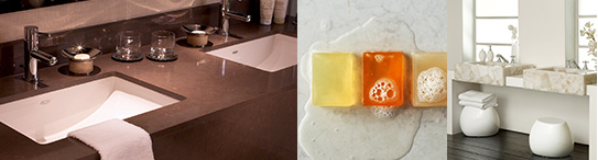 傷や水、汚れに強い素材でありながら、クォーツのもつ美しい色合いや質感が楽しめ、清潔さを保ちたいバスルームにも最適な素材です。