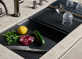 カッティングボードや水切りは、シンクと同一のカラートーン。シンクにピッタリ合う専用設計です。