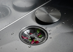 排水ストレーナーもシンク同色仕上げ。ブラックステンレスには同色カバーが付属し、細部まで完成された美しさです。