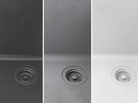 ブラック・グレー・ホワイトの3色で展開するグラニットシンク。メタリック粒子を配合し、手垢や水垢が目立ちにくい仕上げです。